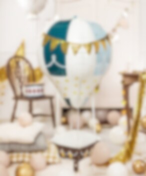 Folieballon met afbeelding van een schattige heteluchtballon in leuke kleuren met details in goudfolie die geschikt is als decoratie voor kinderfeestjes, babyshowers en feestjes. De ballon is 36 x 110 cm opgeblazen en kan worden opgeblazen met helium of gewone lucht.