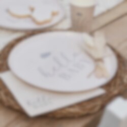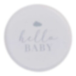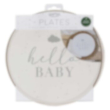 8 papieren bordjes in een mooie neutrale beige kleur en met motieven van het opschrift "Hello Baby" in grijs. Een stijlvolle tafelaanvulling voor de babyshower. De bordjes hebben een diameter van ongeveer 24 cm.