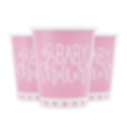 8 roze papieren bekers met witte randen, roze hartjes en ook de tekst "Babyshower" in het wit. De bekers zijn ongeveer 10 cm hoog en hebben een inhoud van ongeveer 270 ml.