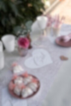 Schattige tafelloper met stippenpatroon in roze en goud en waar de tekst "Girl" te vinden is in decoratieve harten langs de tafelloper. Dek de tafel met deze voor een babyshower of een doop.