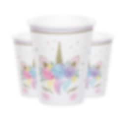 8 papieren bekers met een witte achtergrond, pastelroze en paarse randen, en een afbeelding van een eenhoorn. Een perfect accessoire om toe te voegen aan de setting van je babyshower met een eenhoorn-thema. De bekers zijn ongeveer 10 cm hoog en hebben een inhoud van ongeveer 266 ml.