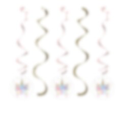 5 hangende decoraties waarvan 3 stuks heeft roségouden whirls en eenhoorn-motieven in pastelkleuren en 2 stuks zijn goudfolie whirls. Echt leuke decoraties om op te hangen voor de babyshower met een eenhoorn thema. 3 van de decoraties zijn ongeveer 76 cm lang en 2 zijn ongeveer 99 cm lang.