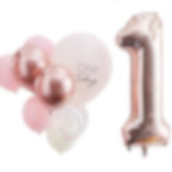 Echt leuk ballonboeket in roze en roségouden kleur met een 1 jaar thema. Versier de kamer hiermee voor het 1e verjaardagsfeestje. Het pakket bevat: