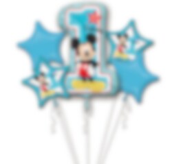 Schattig ballonboeket met een Mickey Mouse 1 jaar-afbeelding. Leuk als decoratie voor de 1e verjaardag. Het pakket bevat een ballon in de vorm van het cijfer 1 (ongeveer 48 x 71 cm) en 4 stervormige folieballonnen (ongeveer 48 cm).