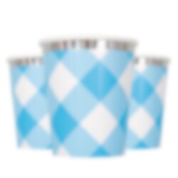 8 papieren bekers in een blauw wit geruite patroon en met zilverfolie randen. Een leuk tafelaccessoire voor het kinderfeestje. De bekers zijn ongeveer 10 cm hoog en hebben een inhoud van ongeveer 270 ml.