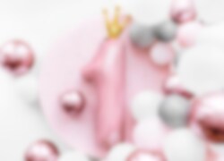Supermooie folieballon in lichtroze die het cijfer 1 voorstelt. De ballon heeft ook een gouden kroon bovenop en is een prachtige decoratie voor een 1e verjaardag.