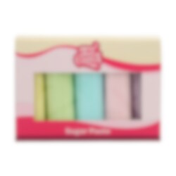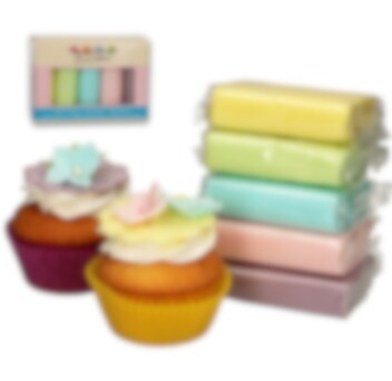 De FunCakes rolfondant multipack pastelkleuren bevat pastelgeel, pastelroze, pastelblauw, pastelgroen en pastel lila fondant en heeft een heerlijke vanille smaak. De apart verpakte kleuren van 100 g zijn perfect om vormpjes uit te snijden en andere versieringen te maken op taarten, cupcakes of koekjes. Deze kleine verpakkingen en felle kleuren zijn ook perfect voor als je met kinderen traktaties wilt versieren. Voor gebruik goed doorkneden, uitrollen op een dun laagje poedersuiker en verschillende vormen uitsnijden. Je kunt de fondant ook gebruiken om te modelleren of om verschillende vormen en ontwerpen te maken. Als je wilt kun je wat tylo poeder gebruiken om de fondant steviger te maken.