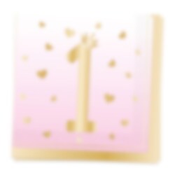 16 servetten in een roze ombre met goudkleurige randen en met motieven van een kroontje erop, evenals hartjes rondom in goudkleur. Leuk om op te nemen in de feestsetting voor het 1e verjaardagsfeestje.