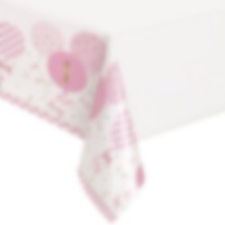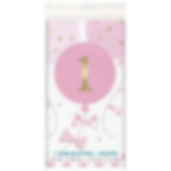 Kunststof tafelkleed met een witte achtergrond en motief van roze ballonnen, strikjes en het cijfer 1 in goud. Een leuk accessoire om op tafel te zetten voor het 1e verjaardagsfeestje. Het tafelkleed heeft een afmeting van 137 x 213 cm.