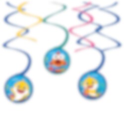 Hangende decoraties in rijke kleuren met afbeeldingen uit het Baby Shark-thema aan beide zijden van de decoratie. Hang deze in de feestzaal voor een leuk effect. Het pakket bevat 3 decoraties van ongeveer 60 cm lang en 3 decoraties van ongeveer 30 cm lang.