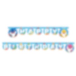 Kartonnen slinger in een blauwe kleur met afbeeldingen van Baby Shark en zijn gezin en de tekst "Happy Birthday" in het wit. Hang deze aan de muur of boven de tafel voor het Baby Shark kinderfeestje. De slinger is ongeveer 2 meter lang.