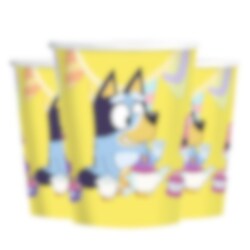 8 papieren bekertjes met mooie afbeeldingen van Bluey. De bekers zijn ongeveer 10 cm hoog en hebben een inhoud van ongeveer 270 ml.