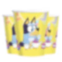 8 papieren bekertjes met mooie afbeeldingen van Bluey. De bekers zijn ongeveer 10 cm hoog en hebben een inhoud van ongeveer 270 ml.