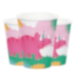 8 papieren bekers met mooie afbeeldingen van dinosaurussen. De bekers zijn ongeveer 10 cm hoog en hebben een inhoud van ongeveer 266 ml.