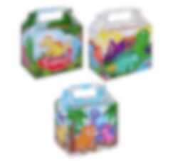 Kleurrijke feestboxen met drie verschillende designs in dinosaurusthema. Perfect om snoep en speelgoed in te doen voor het kinderfeestje. De feestbox is gemaakt van papier en makkelijk op te vouwen.