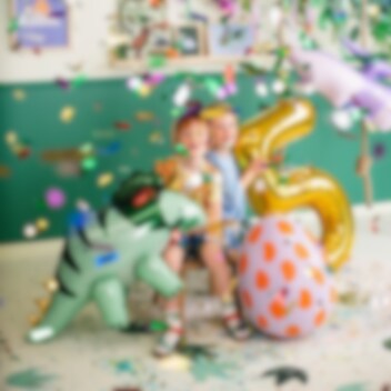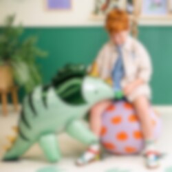 Folieballon met afbeelding van een Triceratops in groene kleuren met goudfolie details als leuke dinosaurus feestdecoratie. De ballon is opgeblazen 101 x 60 cm en kan worden opgeblazen met gewone lucht of helium.