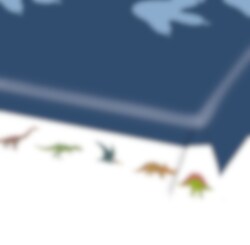 Stijlvol papieren tafelkleed in de kleuren donkerblauw en wit met verschillende dinosaurusafbeeldingen. Het tafelkleed ziet eruit als stof in plaats van papier, waardoor de uitstraling van het tafelkleed exclusiever oogt. Het tafelkleed is ongeveer 115 x 175 cm groot.