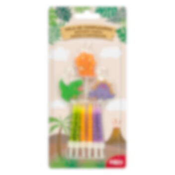 Verpakking met 12 taartkaarsjes in de kleuren paars, geel en groen, samen met 3 iets grotere kaarsjes met afbeeldingen van schattige dino's. De perfecte decoratie om je taart mee te versieren voor een kinderfeestje met een leuk dinothema.