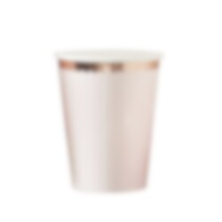 8 mooie papieren bekers in lichtroze met roségouden folieranden. De bekers zijn ongeveer 10 cm hoog en hebben een inhoud van ongeveer 270 ml.