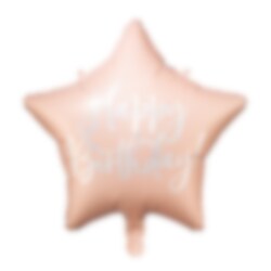 Folieballon in de vorm van een ster in lichtroze met de tekst "Happy Birthday" en sterren in het wit.