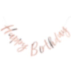 Mooie roségouden folieslinger met de tekst Happy Birthday. Hang dit aan de wand als het tijd is voor een verjaardagsfeestje. De slinger is gemaakt van papier en is ongeveer 150 cm lang.