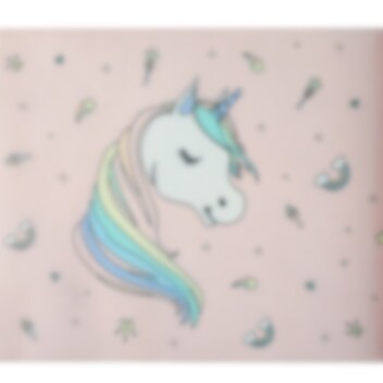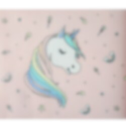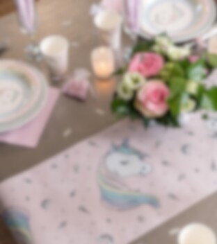 Stijlvolle roze tafelloper met een dessin van een schattige eenhoorn en kleine details zoals ijs, regenboog, kroontje en sterren. Leuk om de tafel mee te dekken als het tijd is voor een eenhoorn kinderfeestje.