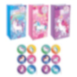 12 uitdeelzakjes met drie verschillende prachtige eenhoornontwerpen, waarbij je 4 zakjes van elk ontwerp krijgt. Deze betoverende zakjes zijn perfect om te vullen met snoep, kleine speeltjes of andere verrassingen voor je gasten.