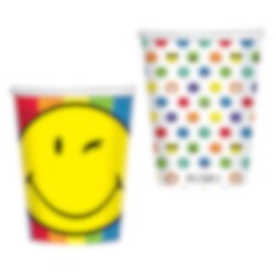 8 papieren bekers in twee verschillende designs met afbeeldingen van verschillende kleurrijke smiley-iconen. Perfect om op tafel te zetten voor je kinderfeestje met een smiley-thema. De bekers zijn ongeveer 10 cm hoog en hebben een inhoud van 250 ml.