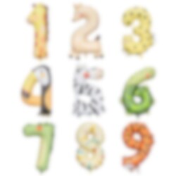 - Diermotief: Elk cijfer vertegenwoordigt een uniek dier: giraffe, hert, luipaard, toekan, zebra, schildpad, krokodil, slang en tijger