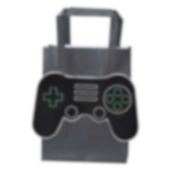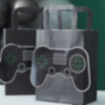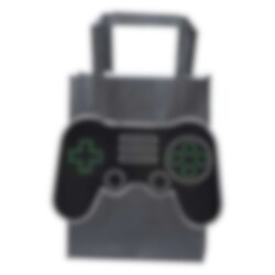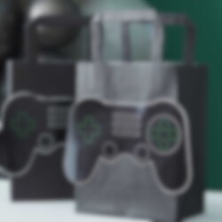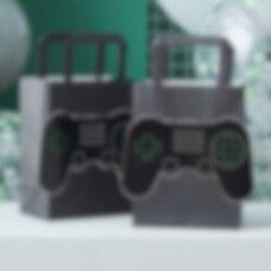5 stuks papier uitdeelzakjes in de kleur zwart met 3D motieven van zwarte spelbesturingen aan de buitenkant. Vul deze zakjes met iets lekkers en een verrassing en geef de zakjes aan je gasten op het kinderfeestje.