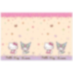 Mooi tafelkleed van plastic met afbeeldingen van Hello Kitty en Kuromi. Het tafelkleed is 120 x 180 cm groot.
