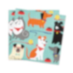 16 kleine mintgroene servetten met afbeeldingen van allerlei schattige hondjes. De servetten zijn tweelaags en hebben een uitgevouwen formaat van 25 x 25 cm.
