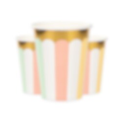 8 papieren bekers in schattige pastelkleuren en goudfolie randen. Leuk om neer te zetten voor het kinderfeestje met Ice Cream Party als thema. De bekers zijn ongeveer 10 cm hoog en hebben een inhoud van ongeveer 266 ml.