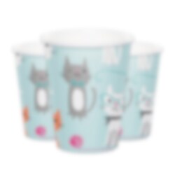8 papieren bekers met schattige afbeeldingen van katten op een mintgroene achtergrond. De bekers zijn ongeveer 10 cm hoog en hebben een inhoud van 266 ml.