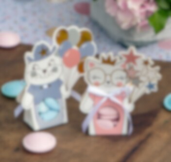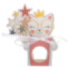 6 kleine doosjes in wit en roze met motieven van een kat die klaar is voor een kinderfeestje. Vul deze met iets lekkers en zet ze op tafel als leuk cadeau voor je gasten als het tijd is voor een katten kinderfeestje.