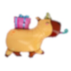 Laat deze schattige folieballon in de vorm van een capybara een speels detail zijn op het kinderfeestje. Met zijn vrolijke Kawaii-design, kleine feesthoedje, een cadeau op zijn rug en een feesttoeter in zijn mond wordt het een charmante decoratie die perfect past bij een kleurrijk kinderfeestje.
