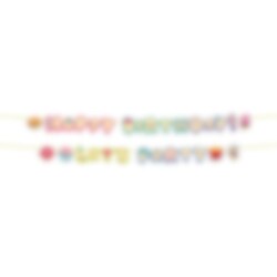 Papieren slinger met de teksten 'Happy Birthday' en 'Let's Party', die een speelse en kleurrijke sfeer creëert op het kinderfeestje. De pastelkleurige letters worden gecombineerd met schattige Kawaii-afbeeldingen van lekkernijen en snacks, wat de slinger een charmante decoratie maakt voor een kinderfeestje met Kawaii-thema.