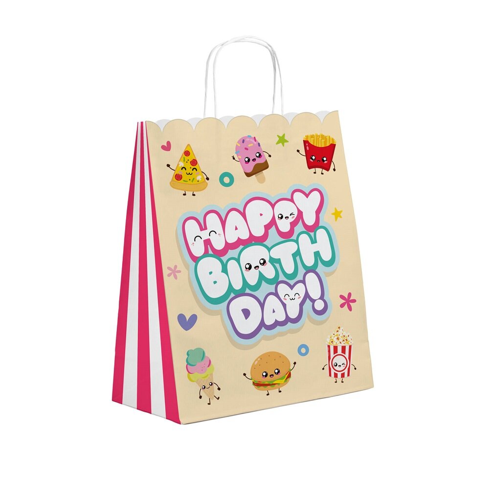 6 uitdeelzakjes met een Kawaii-thema die een kleurrijk en speels detail zijn voor het kinderfeestje. De zakjes zijn versierd met schattige afbeeldingen van fruit, snacks en lekkernijen, samen met de tekst 'Happy Birthday', waardoor ze perfect passen bij een Kawaii-thema kinderfeestje.