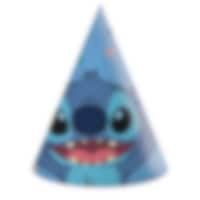 6 blauwe feesthoedjes van karton met schattige afbeeldingen van Disney’s Lilo & Stitch. De hoedjes zijn ca. 19 cm hoog en blijven goed zitten dankzij een comfortabel elastiek.