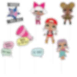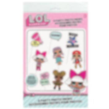 8 photoprops met fancy LOL Surprise-afbeeldingen. Gebruik deze om leuke foto's te maken op het kinderfeestje.