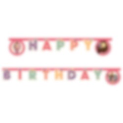Schattige slinger van papier met de tekst "Happy Birthday" en afbeeldingen van Masha en de Beer. Gedecoreerd met schattige details, geïnspireerd door de grappige wereld van Masha en de Beer.