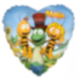 Hartvormige folieballon met een afbeelding van Maya de Bij. De ballon heeft een diameter van ongeveer 45 cm en kan worden gevuld met lucht of helium. De ballon heeft een zelfsluitend ventiel en om hem met normale lucht op te blazen, heb je een ballonpomp of een rietje nodig.