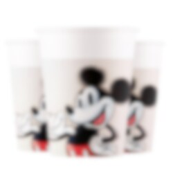 8 papieren bekertjes met een klassiek motief van Mickey Mouse. De bekertjes zijn ongeveer 10 cm hoog en hebben een inhoud van ongeveer 200 ml.