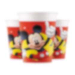 8 papieren bekers in rood en wit met afbeeldingen van Mickey Mouse. Perfect om toe te voegen aan de setting van een Mickey Mouse kinderfeestje. De bekers zijn ongeveer 10 cm hoog en hebben een inhoud van ongeveer 200 ml.