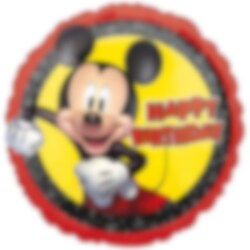 Ronde folieballon in de kleuren rood, zwart en geel met afbeeldingen van Mickey Mouse en de tekst 'Happy Birthday' in het midden in rood. Een decoratieve ballon om bij je te hebben tijdens een kinderfeestje met een Disney- of Mickey Mouse-thema. De ballon heeft een diameter van ongeveer 43 cm en kan worden gevuld met lucht of helium.