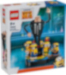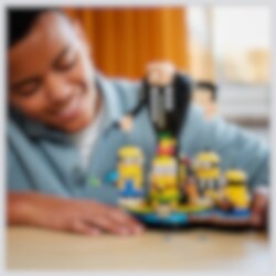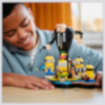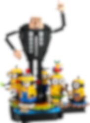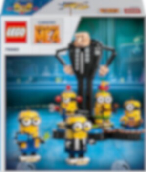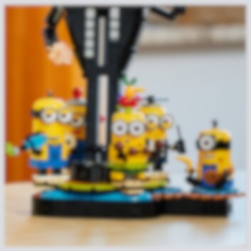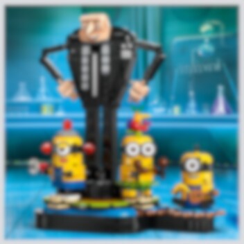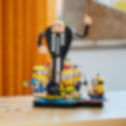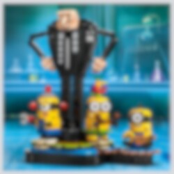 Bouw je eigen Gru en dansende Minions! Zet de armen, handen en vingers van de ex-superschurk in je favoriete houdingen. Bekijk Jerry met zijn sambaballen en fruithoed, geheim agent Dave met een pet met draaiende propeller en walkietalkie, Beedoo Minion met een megafoon, Mel met een ukelele en Kevin met een scheetkanon. Draai aan de zittende Minion en zie hoe de andere Minions rond hun baas dansen!