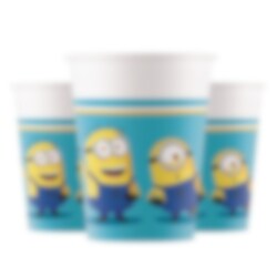 8 papieren bekers in leuke kleuren en met afbeeldingen van de schattige kleine minions die in feeststemming zijn uit de film Minions. Stijlvol om bij je te hebben om de tafel te dekken voor je kinderfeestje met een Minion thema.