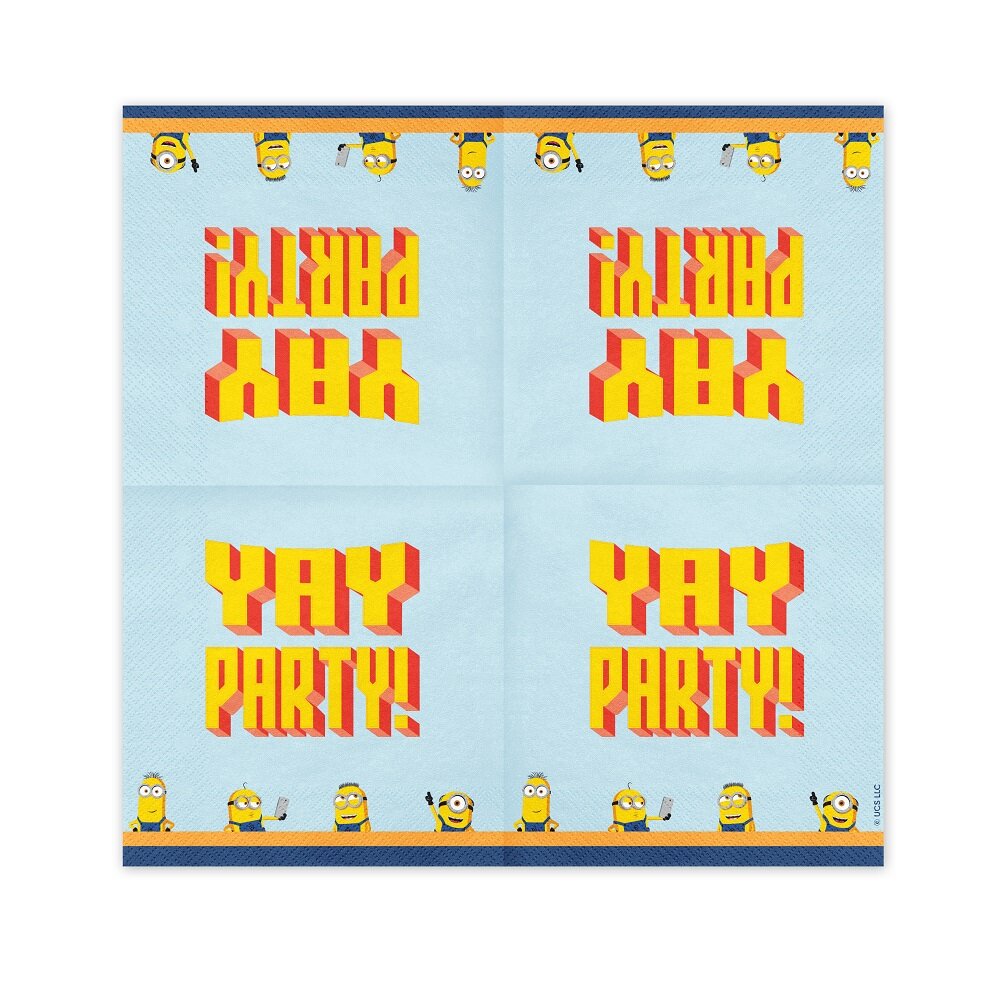12 servetten met een kleurrijke afbeelding van de Minions en de tekst "Yay Party!", en dragen direct bij aan een speelse en feestelijke tafeldecoratie. Perfect voor het kinderfeestje en een eenvoudige manier om een rode draad in het thema te creëren, terwijl ze de tafeldecoratie extra uitnodigend maken.