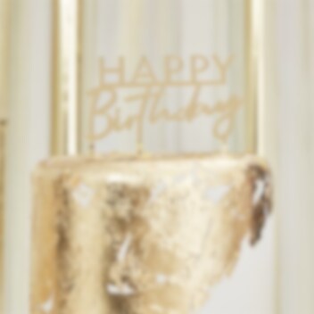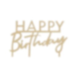Taartdecoratie in een gouden acrylverf die de woorden "Happy Birthday" vormt. De ultieme decoratie om de taart mee te versieren voor alle feesten. De taartdecoratie is ongeveer 10 cm hoog.