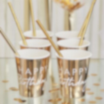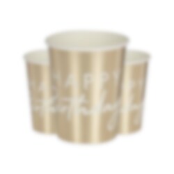 8 goudfolie papieren bekers met motief van de tekst "Happy Birthday" in witte kleur. Leuk om op tafel te zetten voor het kinderfeestje. De bekers zijn ongeveer 10 cm hoog en hebben een inhoud van ongeveer 250 ml.